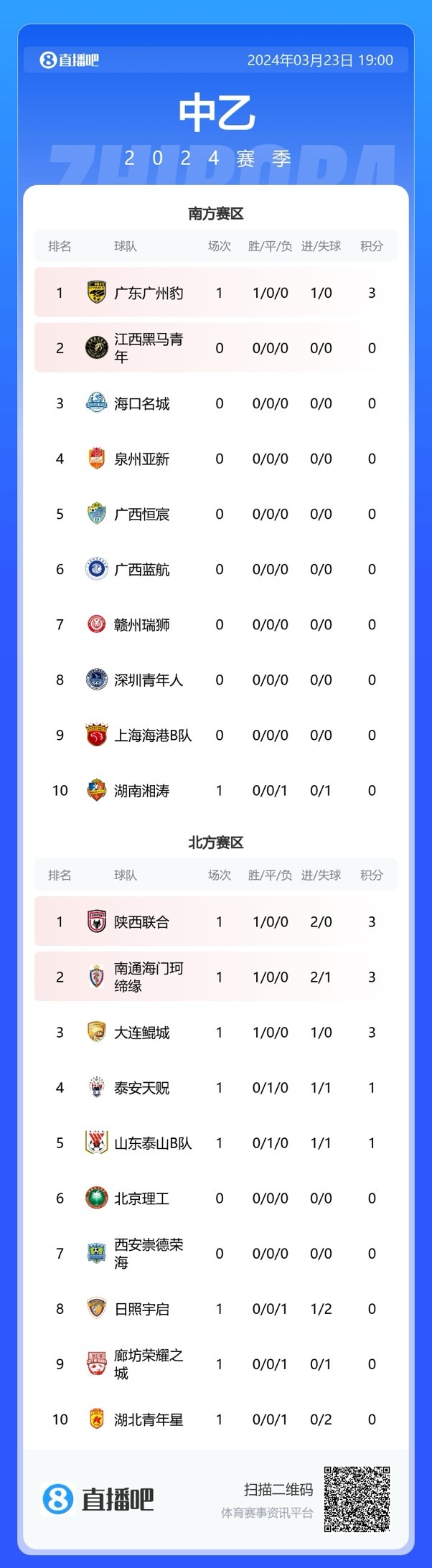 3月23日讯 新赛季中乙联赛今天开幕,第一比赛日进行了第一轮的5场比赛,陕西联合、广东广州豹均取得胜利。