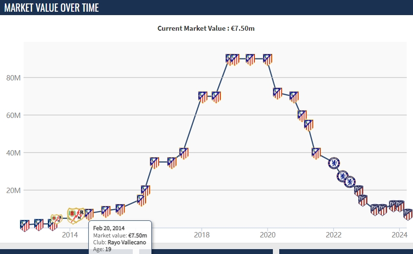 24-25岁时,萨乌尔身价曾稳定在个人巅峰的9000万欧元。