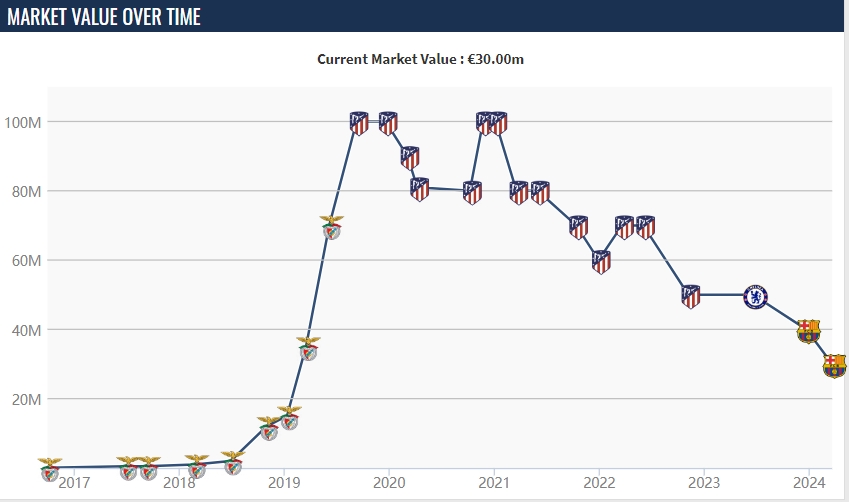 菲利克斯是2019年的夏窗从本菲卡加盟马竞,当时马竞花了1.27亿欧。随后球员在2023年租借过切尔西,现在则是正租借效力巴萨。本赛季菲利克斯各项赛事为巴萨出场34次,贡献9球5助。