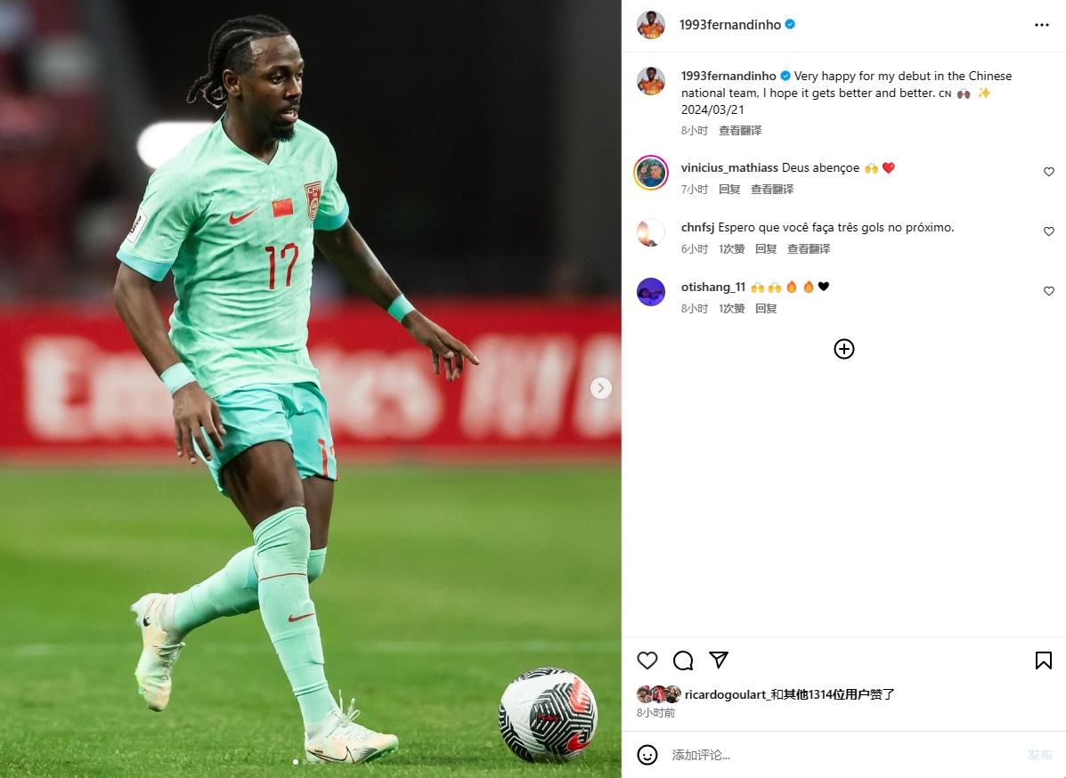 费南多写道:很高兴完成在中国国家队的首秀,希望越来越好。2024/3/21