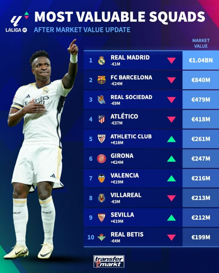 3月24日讯 德转更新了西甲球员身价,并盘点了目前西甲球队身价榜,其中皇马以10.4亿欧高居榜首,巴萨次席,以下为具体榜单: