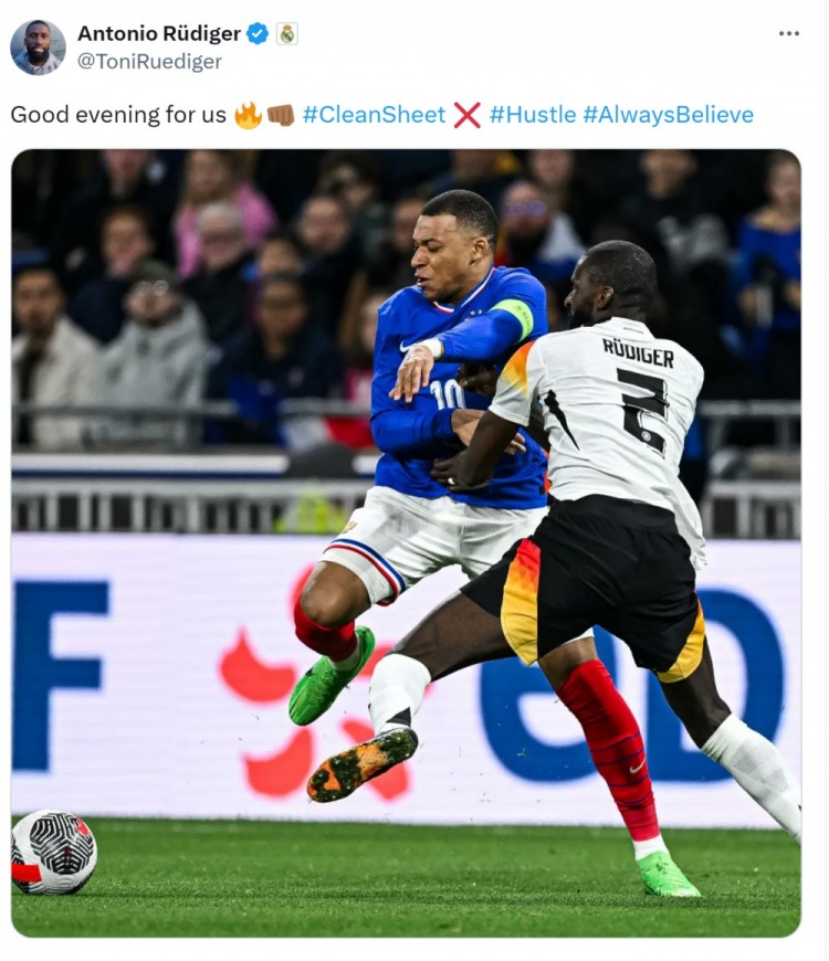 吕迪格在社交媒体上晒出防守姆巴佩的照片,并写道:“对我们来说是很好的夜晚