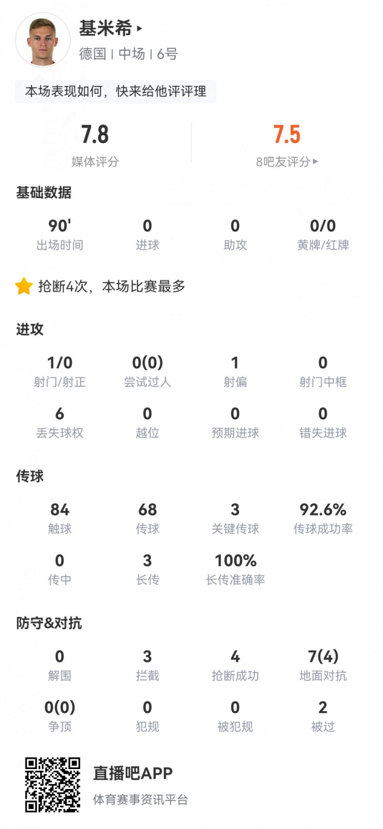 数据方面,基米希本场比赛3次关键传球,3次拦截,4次抢断全场最多,被过2次,评分7.8分。