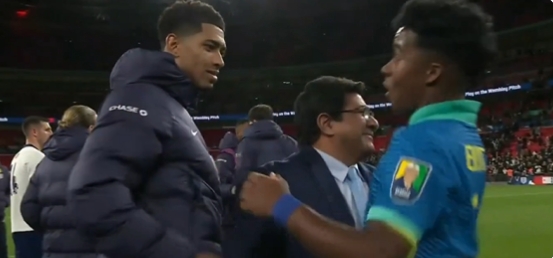 赛后,恩德里克与贝林厄姆、维尼修斯、罗德里戈拥抱,贝林厄姆在恩德里克面前先拍了下恩德里克的脸。