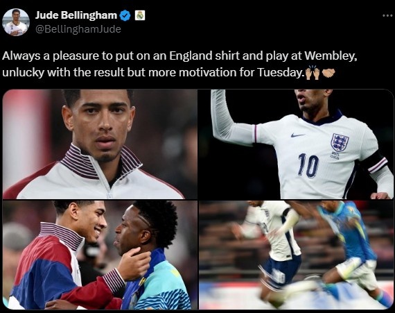今天凌晨,英格兰在温布利的友谊赛0-1不敌巴西,贝林厄姆晒出自己比赛中的一些照片,并写道:“穿上英格兰球衣并在温布利踢球总是一种享受,结果很不走运,但这让我们对周四的比赛更加有动力。”