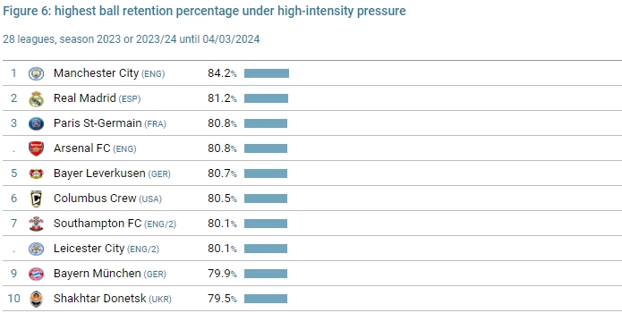 03月24日讯 著名足球统计机构cies统计了各个球队面对高压防守的表现,结果曼城第1,,皇马第2,巴黎、阿森纳第3。