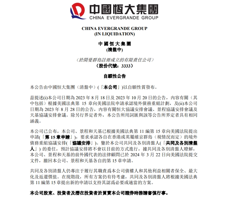 3月24日,中国恒大集团发布自愿性公告,撤回境外债务重组申请。