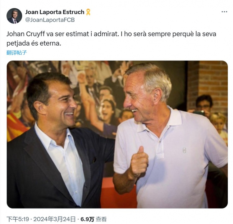 拉波尔塔上传了与克鲁伊夫的合影,并配文写道:“克鲁伊夫受到爱戴与钦佩,这将一直持续下去,因为他的足迹是永恒的。”