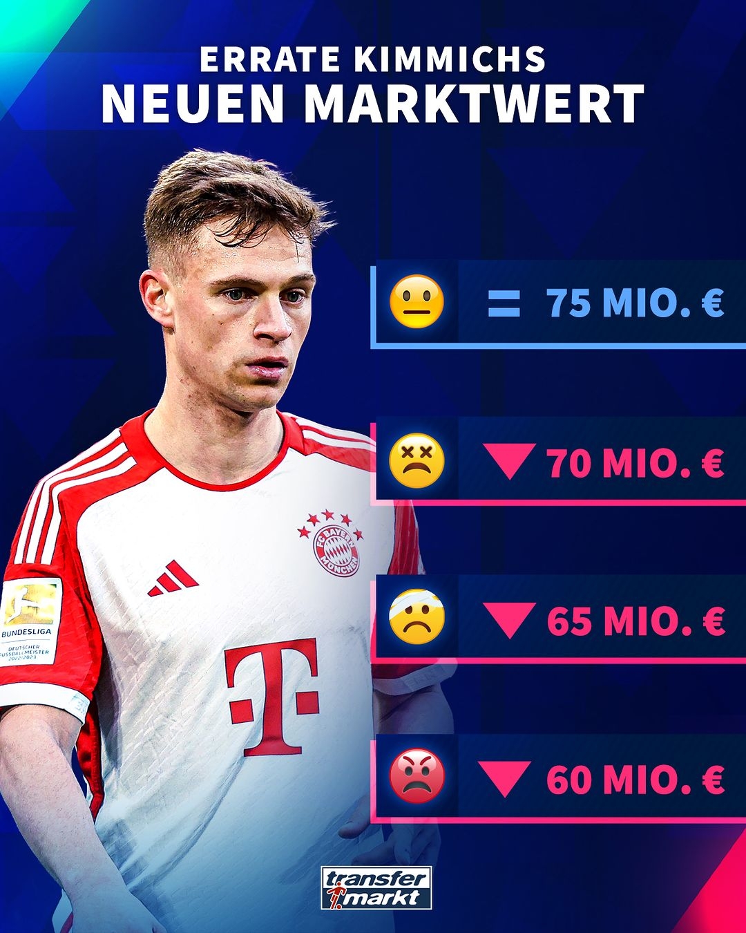 德转给出四个选项:7500万欧维持不变、跌至7000万欧(跌500万)、跌至6500万欧(跌1000万)、跌至6000万欧(跌1500万)。吧友们觉得基米希的身价会跌多少?