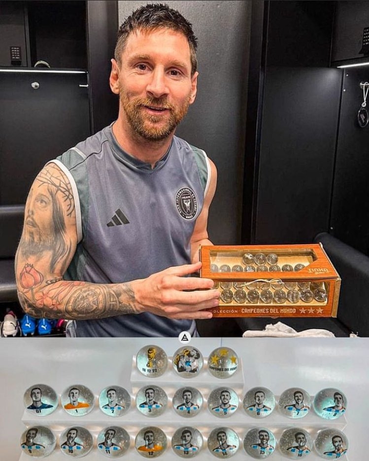 3月25日讯 日前,梅西晒出了自己与一套世界杯冠军纪念弹珠的合影。