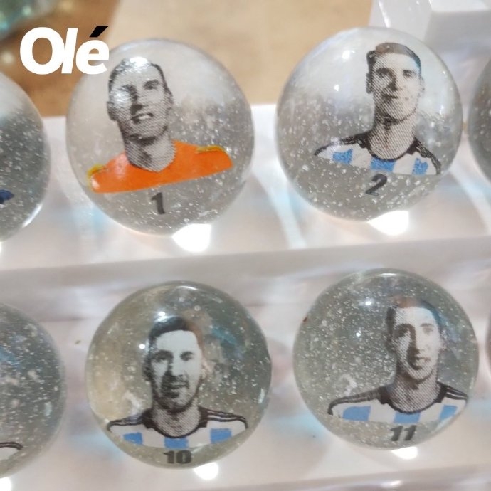 这套弹珠共有30颗,其中26颗印有卡塔尔世界杯冠军成员的头像,剩余4颗分别印着:斯卡洛尼头像、决赛日期和大力神杯、梅西亲吻奖杯以及三颗星。