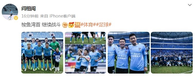 3月25日讯 今天,老将阎相闯更新社媒,庆祝大连英博在新赛季中甲喜迎三连胜。