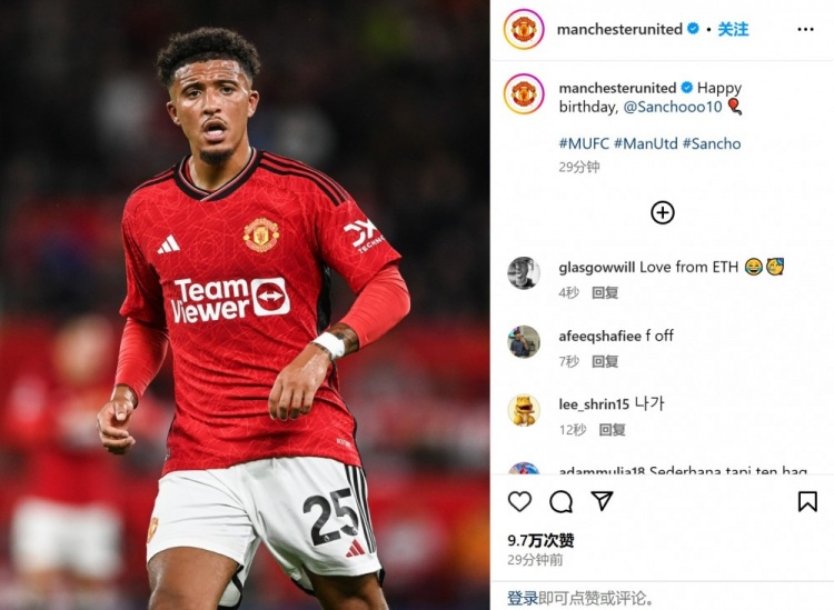 曼联晒出球员身披红魔战袍出战时的照片,并写道:生日快乐,@桑乔