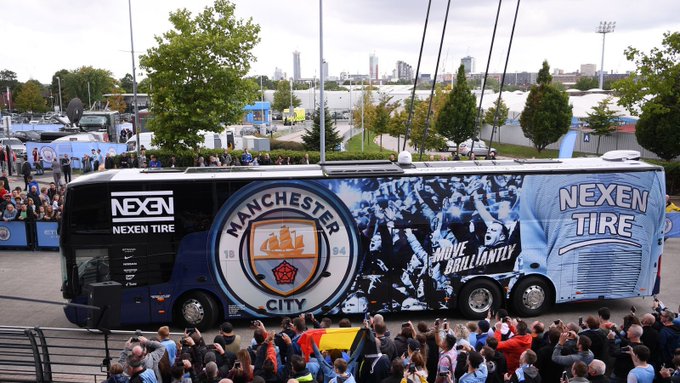 近日,曼城U23坐着印有上赛季五座奖杯的大巴,前往利物浦训练基地比赛