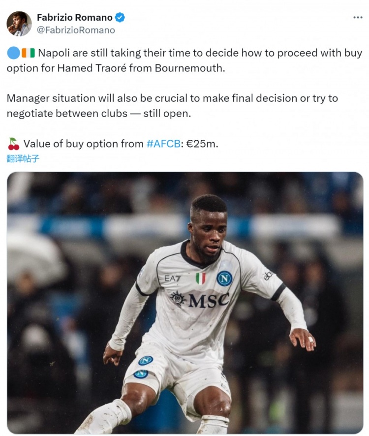 3月25日讯 据知名记者罗马诺透露,那不勒斯仍在考虑是否买断哈米德-特拉奥雷,选择买断费用2500万欧元。