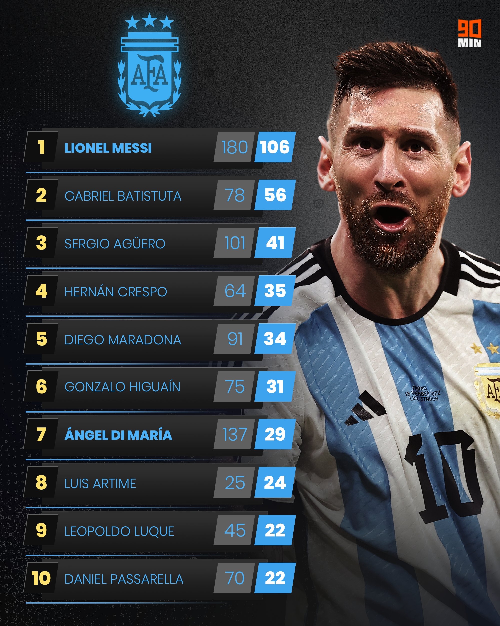 3月26日讯 日前,英媒90min盘点了阿根廷国家队出场数和进球数排行,梅西180场106球居首。