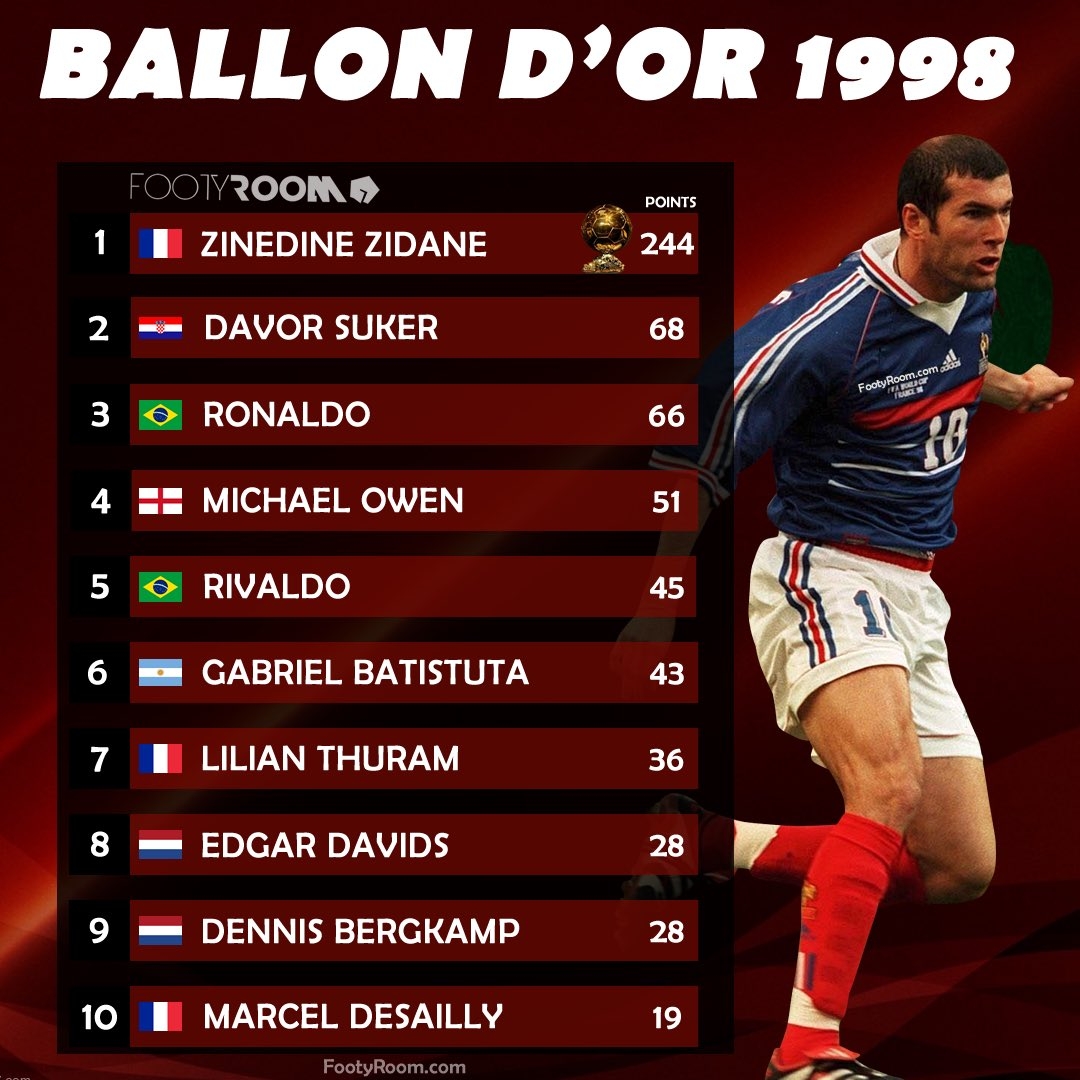 3月26日讯 1998年金球奖排名前十位的球员,带领法国队登顶世界杯的齐达内当选,苏克次席,罗纳尔多第三。