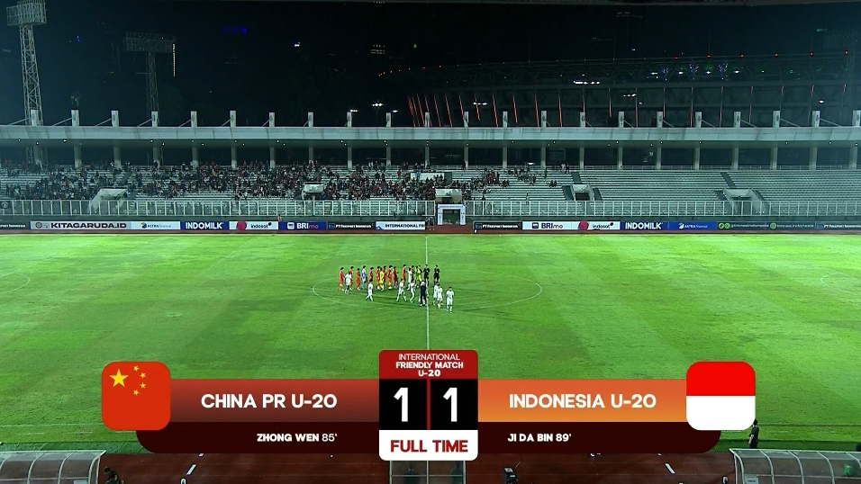 U19国青友谊赛客场再战印尼国青,钟文破门,印尼89分钟世界波绝平,U19国青1-1印尼国青。