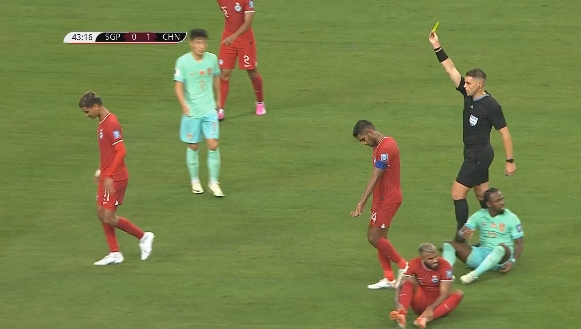 3月21日讯 世预赛第3轮,中国男足客场对阵新加坡。上半场第44分钟,费南多突破遭对手强力飞铲,裁判出示黄牌。