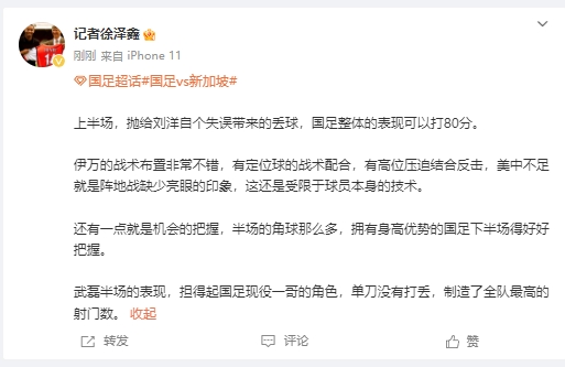 世预赛亚洲区,中国男足vs新加坡男足,上半场双方1-1平。记者徐泽鑫点评上半场比赛。
