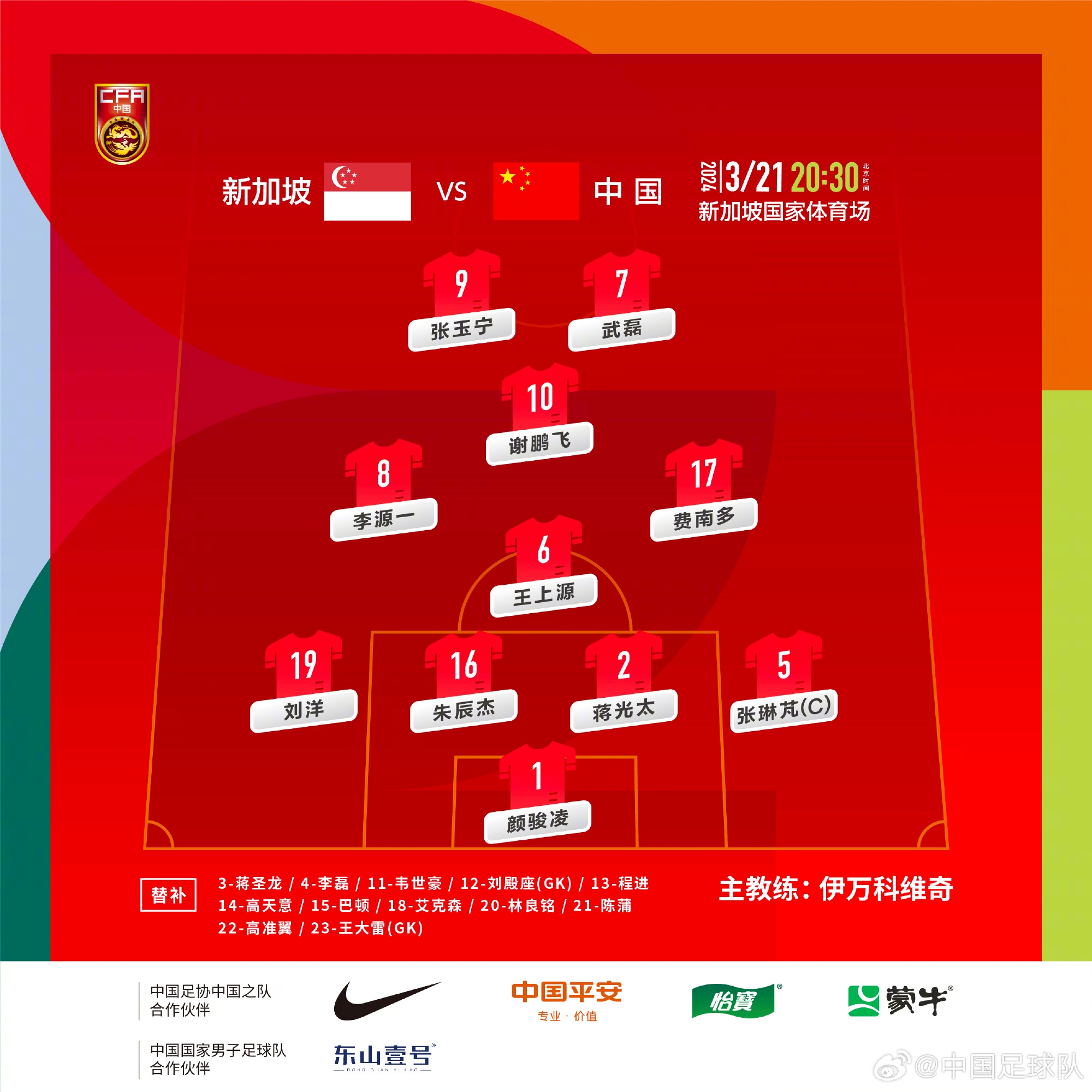 和上周在客场2-2战平新加坡的比赛相比,本场比赛国足在首发上做了3处调整,分别是门将位置王大雷首发,高准翼顶替张琳芃,高天意顶替王上源。