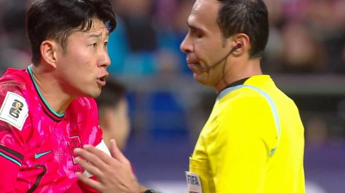 孙兴慜禁区内倒地,裁判吹他进攻犯规,孙很不满