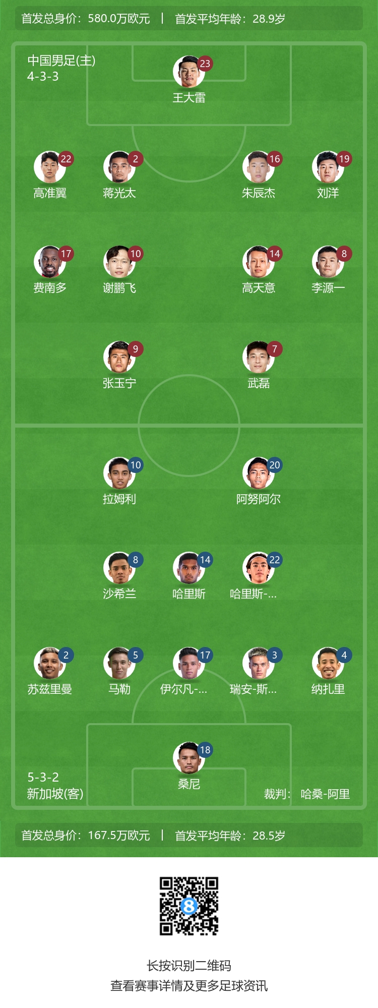03月26日讯 今天20:00,男足世预赛亚洲区第二阶段C组第4轮,中国队坐镇天津奥体中心体育场主场迎战新加坡队。赛前双方首发阵容出炉,王大雷出任国足首发门将,武磊担任队长,张琳芃替补。【上,看世预赛!全程直播国足36强赛】
