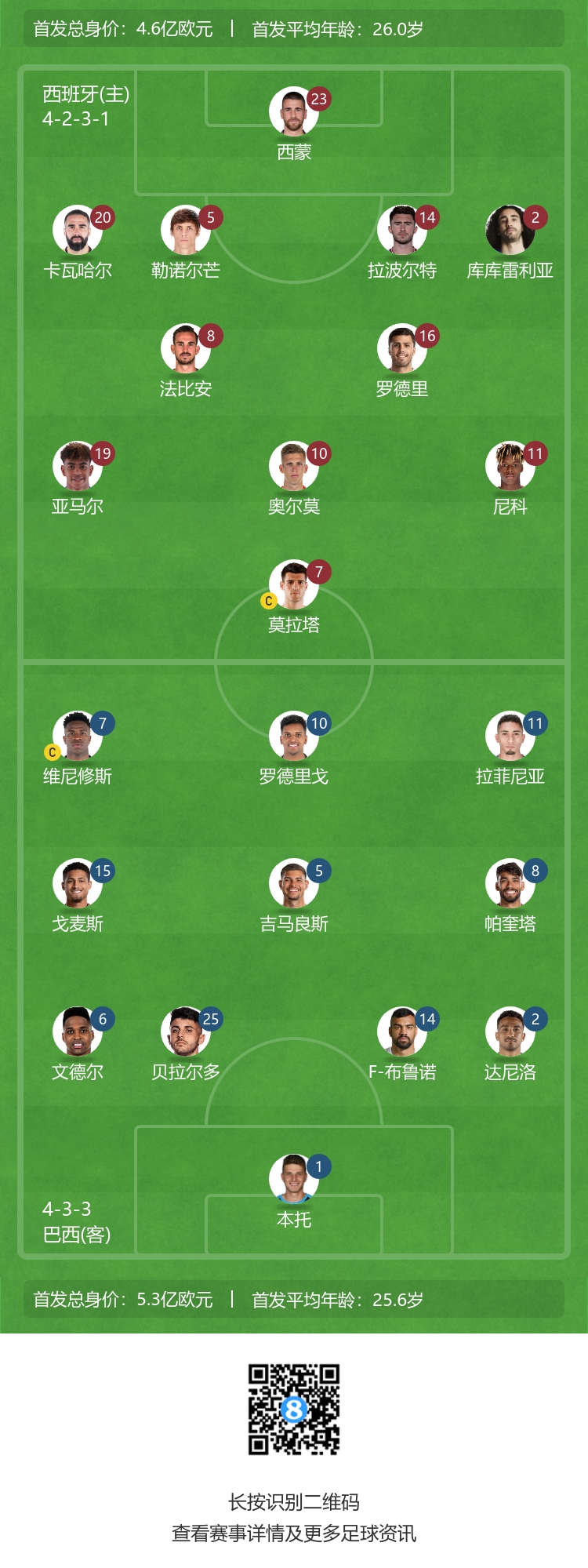 西班牙首发:23-乌奈-西蒙、14-拉波尔特、20-卡瓦哈尔、2-库库雷利亚、5-勒诺尔芒、16-罗德里、8-法比安-鲁伊斯、10-奥尔莫、11-尼科-威廉姆斯、19-亚马尔、7-莫拉塔
