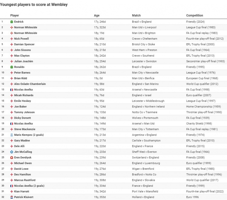 此前,在温布利进球最年轻球员的纪录保持者为诺曼-怀特塞德(Norman Whiteside),而且他曾两次创下纪录。1995年的一场友谊赛,巴西传奇球星罗纳尔多在对阵英格兰时取得进球,他以18岁262天在这份榜单中位居第9。