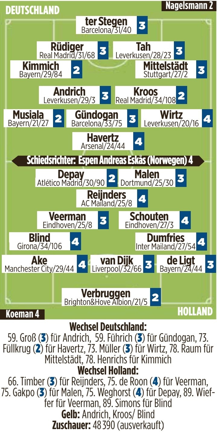 3月27日讯 在北京时间今天凌晨进行的友谊赛中,德国2-1逆转荷兰,德国媒体《图片报》为两队球员评分,基米希、克罗斯、穆西亚拉、菲尔克鲁格、德佩、维尔布鲁根2分最高(德媒评分1分最高,6分最低)。