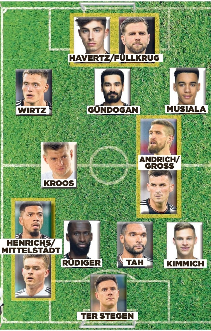 3月21日讯 德国队将在3月份的友谊赛中对阵法国和荷兰,据《图片报》透露,德国这两场比赛首发阵容中的8个席位已经确定,维尔茨、克罗斯、京多安、基米希在列。