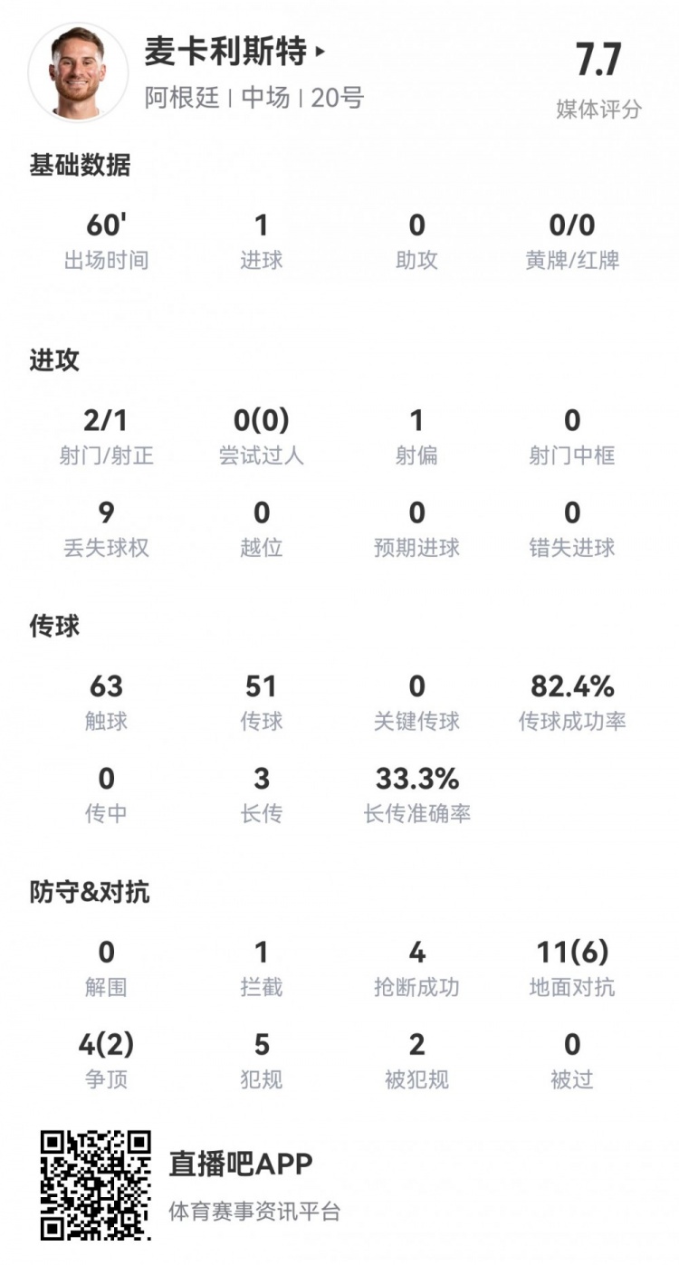 3月27日讯 正在进行的友谊赛,阿根廷2-1暂时逆转领先哥斯达黎加。麦卡利斯特打进反超进球后被换下,球员全场重点数据如下↓