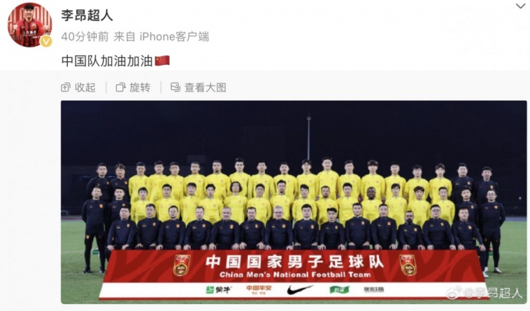 今晚20:30,国足将迎来客场与新加坡的世预赛比赛。赛前,李昂在社媒晒出了本期国足的全家福并配文“中国队加油加油