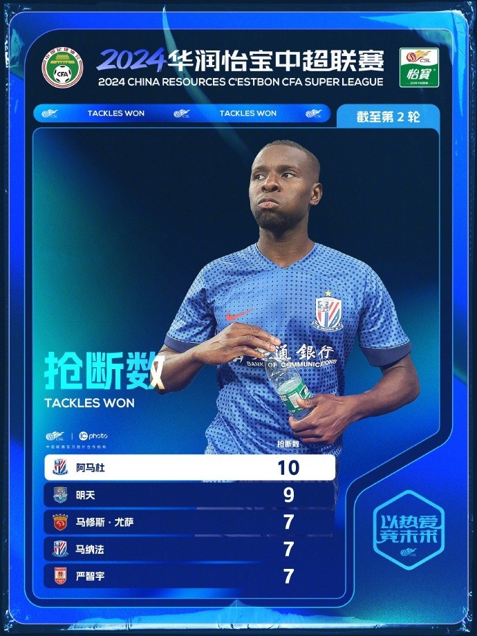 中超官方统计显示,新赛季中超前两轮,上海申花球员阿马杜完成10次成功抢断,领跑联赛抢断榜;同时他也完成了139次成功传球,领跑联赛成功传球榜。