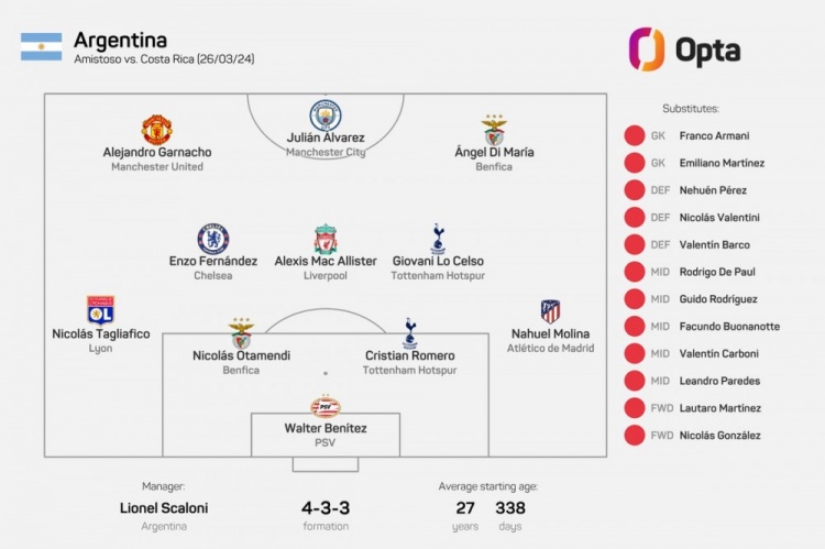阿根廷公布了此役的首发名单,Opta指出,阿根廷此役首发阵容中6名球员在英超踢球,而且全部来自BIG6俱乐部。