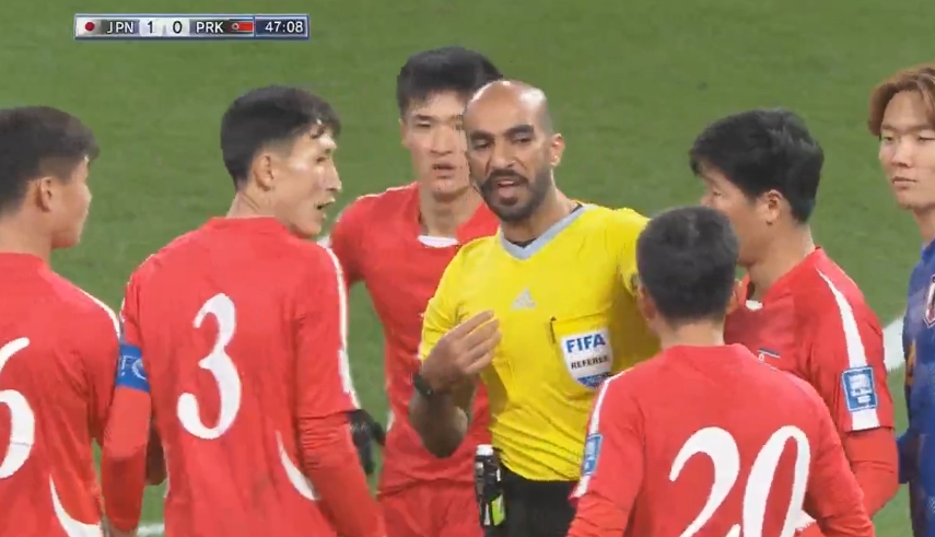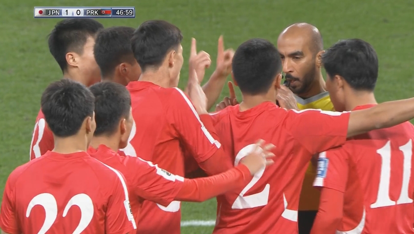裁判做出进球无效的判罚后,朝鲜球员非常不满↓