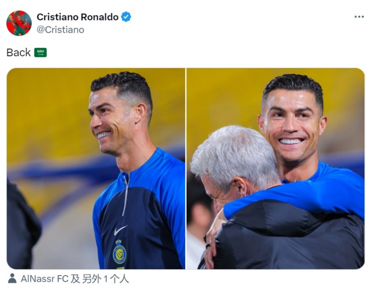 3月29日讯 C罗更新社媒,晒出自己回到利雅得胜利的照片。