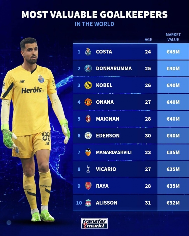 3月29日讯 德国转会市场统计了足坛身价排名前十的门将,其中,波尔图的葡萄牙国门迪奥戈-科斯塔以4500万欧身价独居榜首,埃德森、奥纳纳、迈尼昂等多人均为4000万欧。