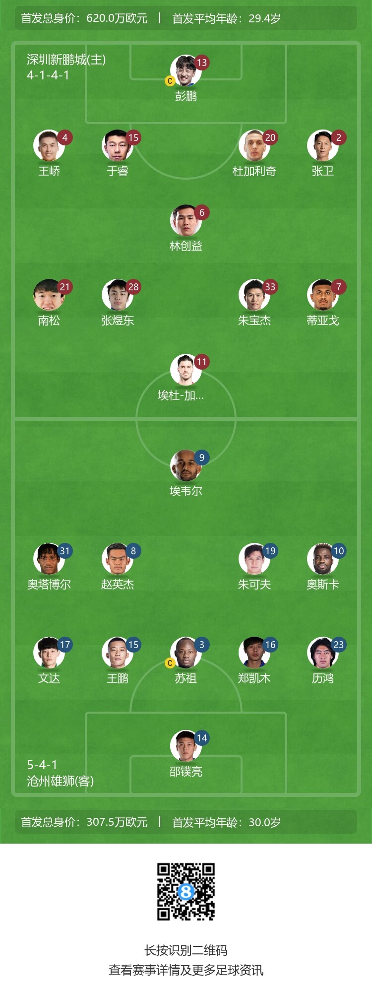 3月29日讯 北京时间今天19:35,中超第3轮,深圳新鹏城主场迎战沧州雄狮,赛前双方公布首发阵容。