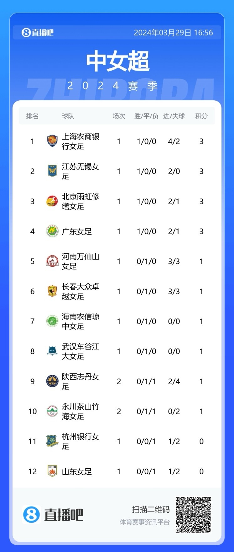 积分榜方面,两队前两轮均取得1平1负的战绩,分列第9位和第10位。女超第2轮其余5场赛事将于明后天进行。