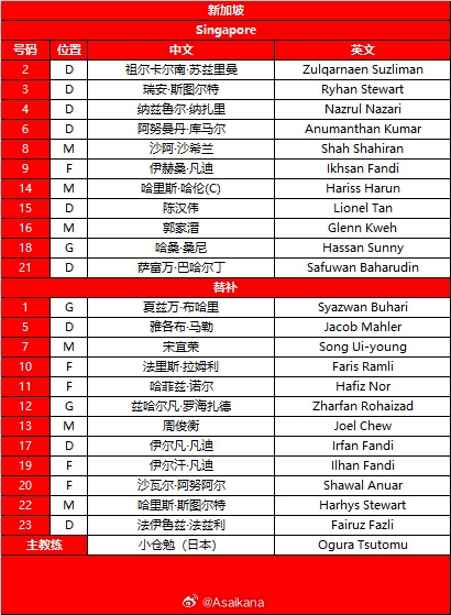 2026年美加墨世界杯亚洲区预选赛 新加坡vs中国 首发名单