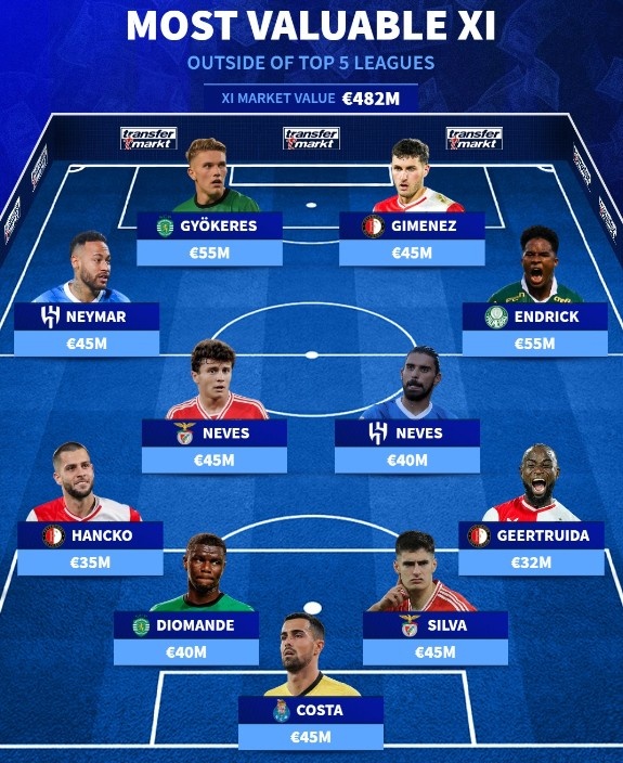 前锋:内马尔(利雅得新月,4500万)、约克雷斯(葡体,5500万)、吉梅内斯(费耶诺德,4500万)、恩德里克(帕尔梅拉斯,5500万)
