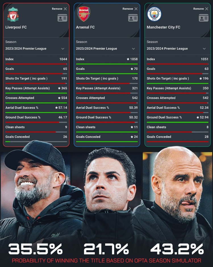配图为“OPTA”分析计算的三强夺冠概率:曼城43.2%、利物浦35.5%、阿森纳21.7%。