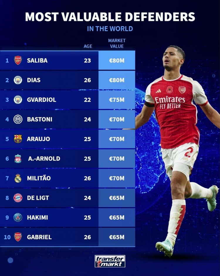 3月30日讯 德国转会市场列出了足坛现役身价最高的前十名后卫,其中,萨利巴和鲁本-迪亚斯的最新身价均为8000万欧,并列榜首,格瓦迪奥尔7500万欧紧随其后。阿诺德、米利唐等人均榜上有名。