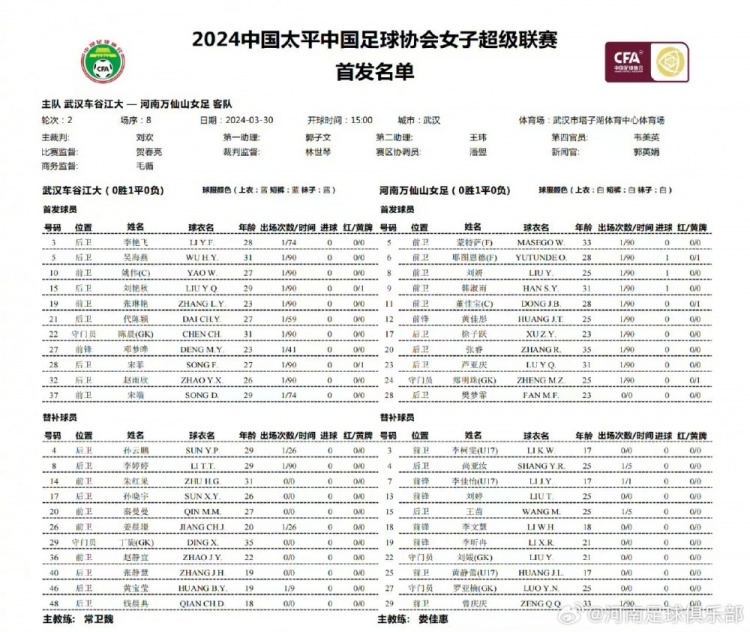 北京时间3月30日15:00,2024中国太平中国足球协会女子超级联赛第二轮,河南万仙山女足客场对阵武汉车谷江大女足。