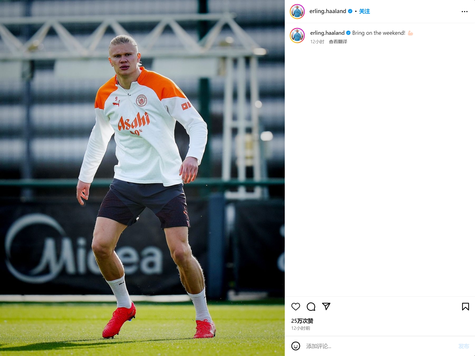 蓄势待发战枪手!哈兰德晒训练照:周末来吧!