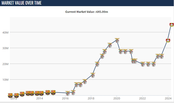 目前格里马尔多的身价已经从加盟时的2500万欧,暴涨至生涯新高的4500万欧。
