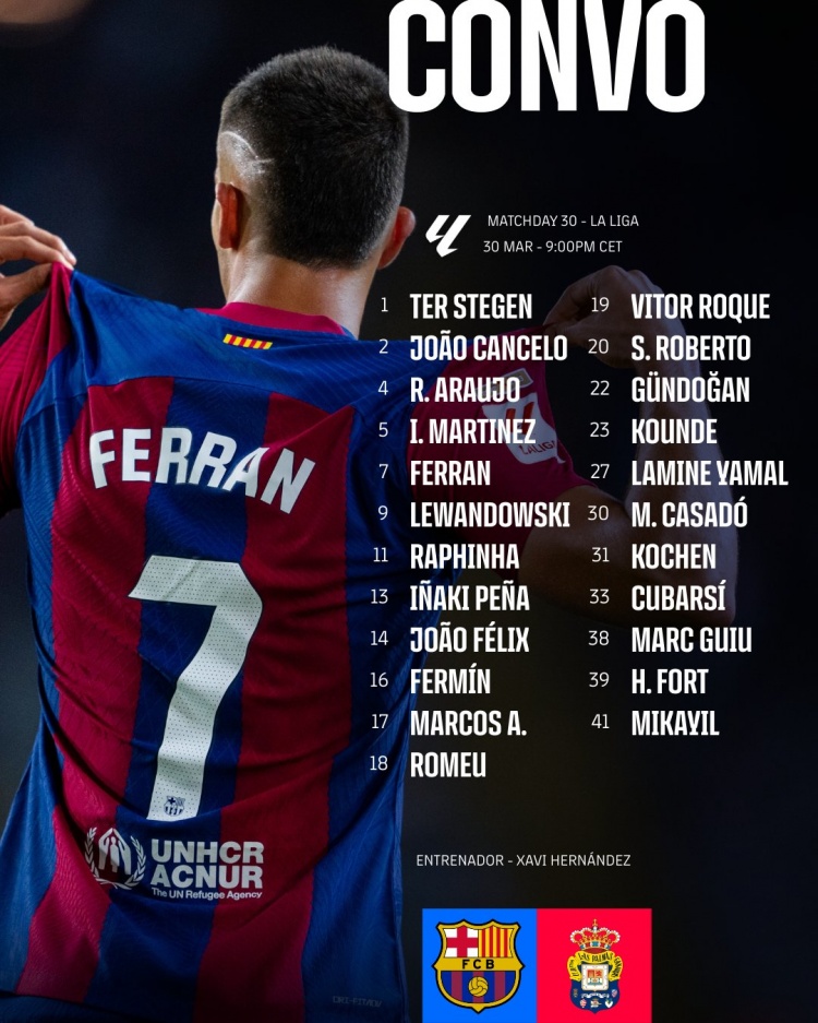 3月30日讯 巴萨将在西甲等30轮主场交手拉斯帕尔马斯,巴萨公布本场比赛大名单。