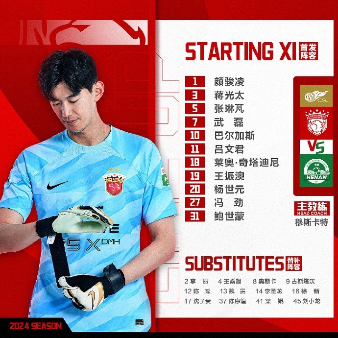 2024中超联赛第3轮 上海海港VS河南俱乐部酒祖杜康首发及替补名单