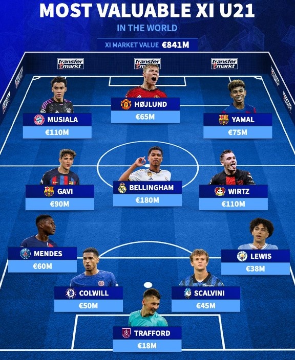 3月31日讯 《转会市场》更新了U21球员最贵阵容,贝林厄姆领衔。